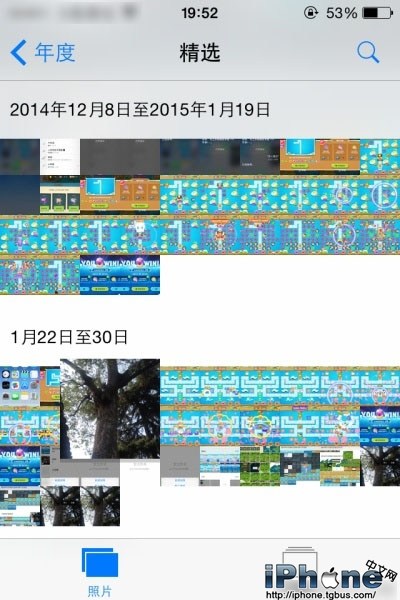 在iOS8相冊中,可以按照“年度”或“精選”來查看照片,查看更多照片的縮略圖。不過,這種縮略圖比較小。其實也可以更大的縮略圖方式預覽。具體操作如下: