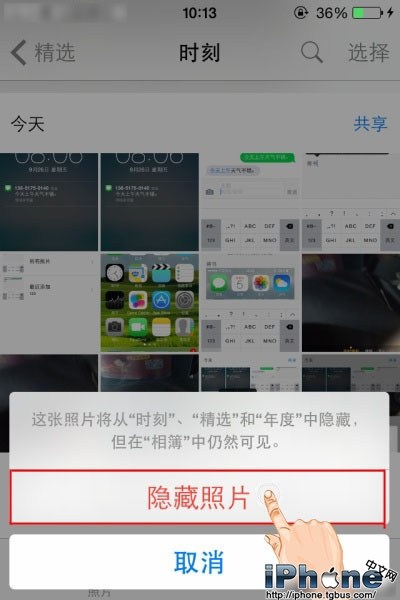 第二步,接著,點擊“隱藏照片”,即可成功隱藏照片,這樣在“年度、精選、時刻”中不顯示該照片了,但在相薄中仍然可見。