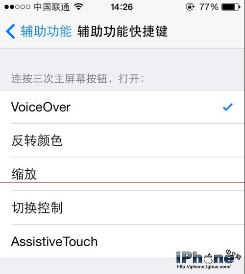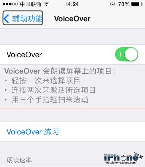 6、打開這個輔助功能快捷鍵(VoiceOver)就會出現下面的界面把第一個選項勾選上就可以了下次連按三次主屏幕按鍵就會出現這個功能再按三次就取消這個功能。
