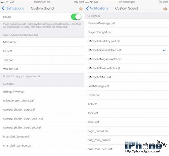 插件為你提供了一些候選的通知聲音進行選擇,如果你不喜歡預設的聲音的話,你還可以自己制作鈴聲,然後添加到 /System/Library/Audio/UISounds 路徑即可。