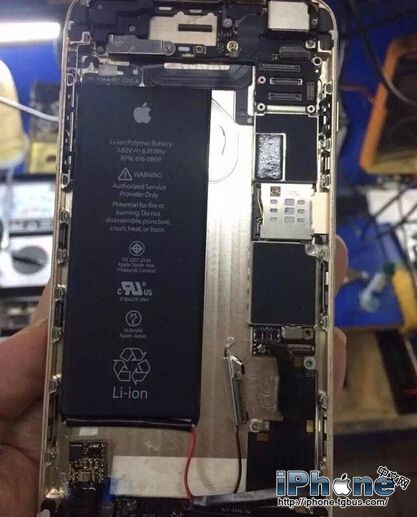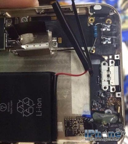 從圖片來看,這部iPhone6 Plus後殼內部顯得空空蕩蕩的,而且還有“飛線”存在,顯然不是原裝品,而是通過其它機型修改而來的(據說是iPhone6)。