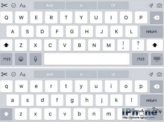 鍵盤:打開shift,鍵盤上展示大寫字母;關閉shift,鍵盤展示小寫字母。在iPad上,iOS9支持多個新的編輯控制,並使用新的San Francisco字體。