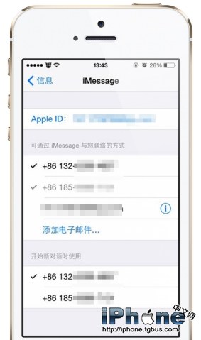 依次進入設置-信息-發送與接收,將132號碼添加為接收號碼,並且Apple ID也要與132機子上一樣(不然我們就沒有文本信息轉發選項)。這時,我們就能夠看到這個設備能夠管理兩個號碼的信息了。