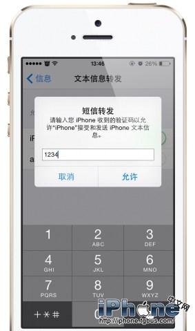 在185上點擊短信轉發按鈕,片刻後,132設備將會收到“您的電話號碼現已在一台新的iPhone上用於iMessage的通知”然後會發送一個驗證碼過去。這時,在185設備上輸入132設備上的驗證碼,兩台設備就關聯完成了。( 兩台設備都需要聯網,不然無法關聯)。
