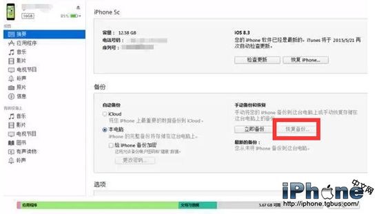 4、等待iPhone刷機完成,刷機成功後,開始恢復原來的手機數據,這時我們iTunes中的 “恢復備份”。