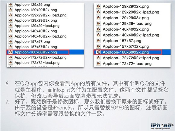 7. 言歸正傳,我們以修改圖標為例,接下來就替換掉原來的圖標就好了。由於我使用的設備是iPhone5s,所以只需替換60*60的圖標,注意新圖標文件的分辨率要與替換的文件一致。