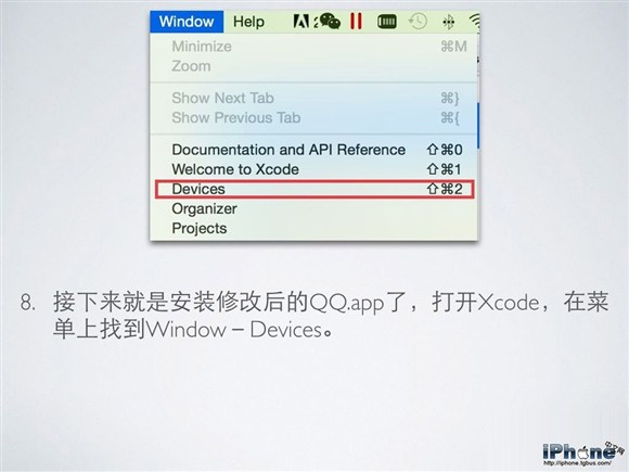 8. 接下來就是安裝修改後的QQ.app了,打開Xcode,在菜單上找到Window - Devices。