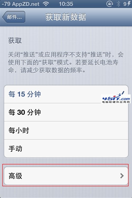 8.如果需要針對不同的郵箱設置不同的獲取新數據方法,點擊頁面底部的高級,可以分別設置不同郵箱的數據獲取方法