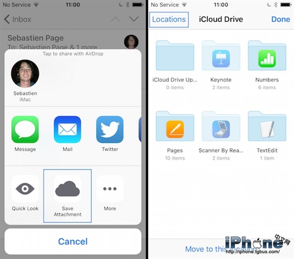 3、如果你想將這個附件保存到其它的服務,例如Dropbox,你可以點擊左上角的“Locations”按鈕進行操作,只是由於現在Dropbox還不支持iOS9,所以截圖中出現了錯誤的提示。