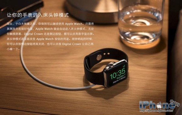 在使用床頭鐘模式的時候也要注意,由於 Apple Watch 此時是側放狀態,而鬧鐘會使得 Apple Watch 產生輕微的震動,因此要使用床頭鐘模式的話,建議將手表放在較為柔軟的平面上,以防因震動致使 Apple Watch 一側受到磨損。