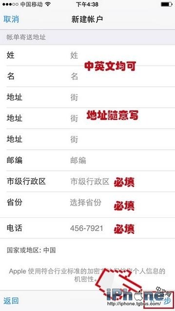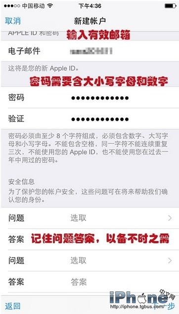 7、填寫創建Apple ID需要的相關信息。請注意郵箱要寫真實的,因為後面需要驗證!密碼需包含大小寫字母及數字!密保問題要記住答案,方便到時候找回密碼!