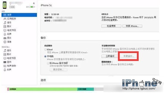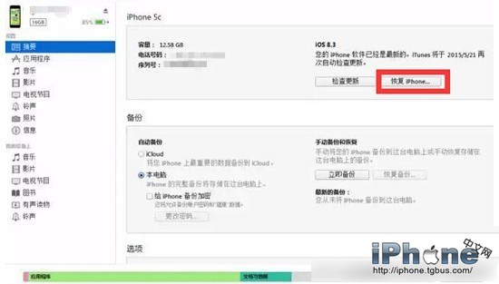 4、等待iPhone刷機完成,刷機成功後,開始恢復原來的手機數據,這時我們iTunes中的 “恢復備份”。