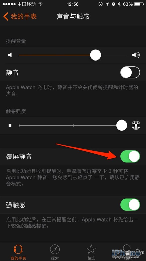 如果你啟用了Apple Watch的通知的話,在一些不方便的場合,你可以瞬間將其靜音:那就是使用你的手掌覆蓋住Apple Watch屏幕三秒。轉到iPhone上的Apple Watch應用程序,然後進入「我的手表」-「聲音和觸感」部分,然後開啟「覆屏靜音」項即可。
