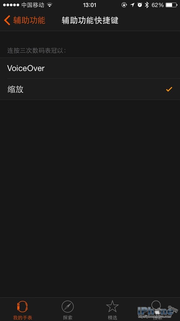 縮放和VoiceOver可以設定為使用三擊快捷呼出。轉到iPhone上的Apple Watch應用程序,然後在「我的手表」-「通用」-「輔助功能」-「輔助功能快捷鍵」部分,在這裡你可以選擇其中的選項。