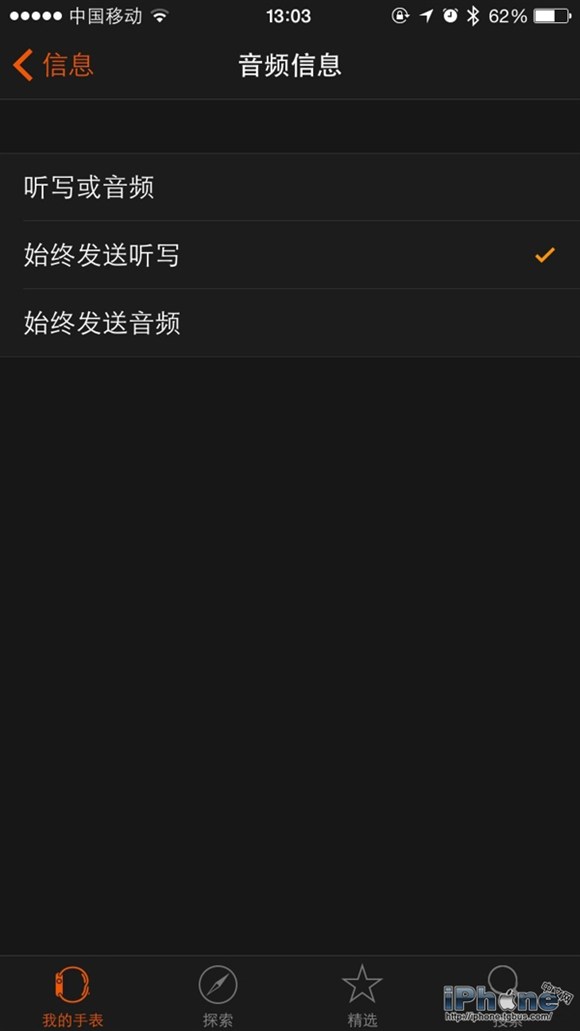 當你使用「聽寫」回復信息時,Apple Watch提供了兩個選擇:使用文本形式發送、發送音頻信息。如果你偏好音頻信息的話,你可以設定其為默認。在iPhone上打開Apple Watch應用程序,轉到「我的手表」-「消息」-「音頻信息」部分選擇即可。