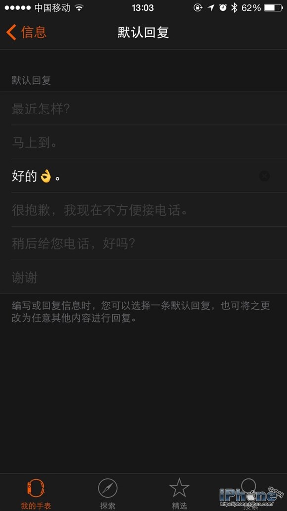 你無法直接在Apple Watch上打字,但你可以設置一系列預設的回復信息,在收到信息時,只需從中進行選擇即可。在你的iPhone上打開Apple Watch應用程序,轉到「我的手表」-「信息」-「默認回復」部分進行編輯。