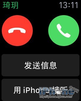 使用Apple Watch接聽電話總是給人一種酷酷的感覺,但是有時候並不是每個人都會這麼做。那麼當他人來電時,iPhone還在另一個房間,你可以在Apple Watch上選擇「用iPhone接聽」來保持他人的呼叫,然後走進房間用iPhone來接聽。這段時間內,另一端的人會聽到短促的聲音重復。