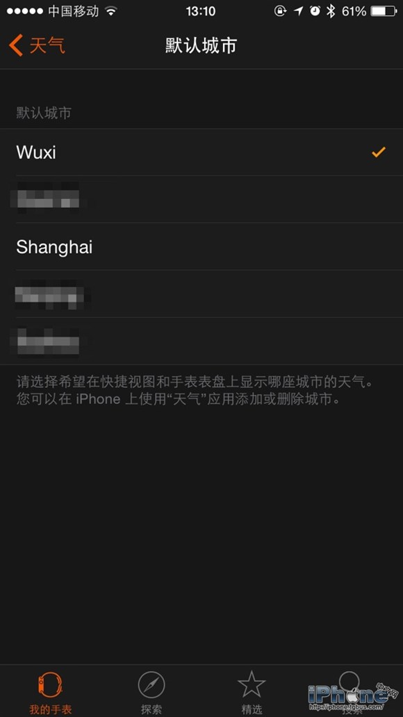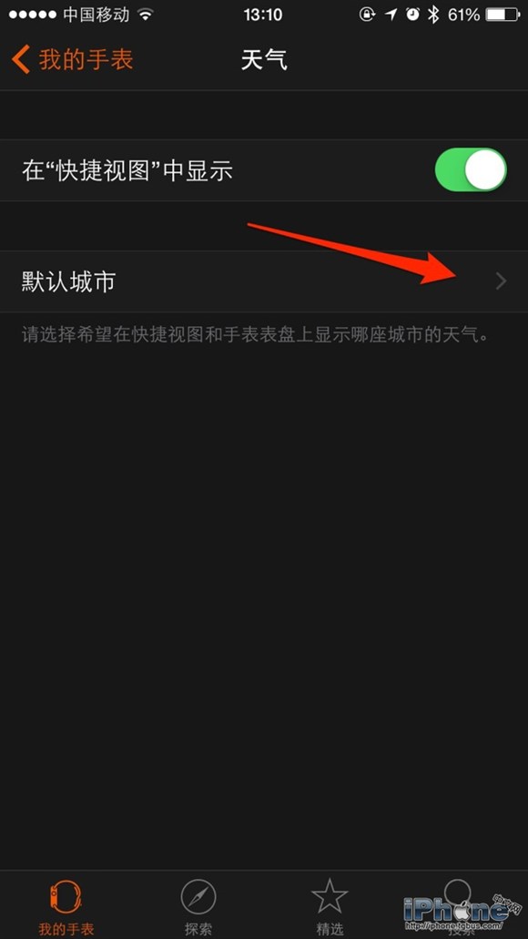 Apple Watch的「天氣」應用程序中你可以設定多個城市 / 地區的天氣。但是在Glances視圖中你可以設置一個默認城市來快速預覽其天氣狀況。在你的iPhone上打開Apple Watch應用程序,轉到「我的手表」-「天氣」-「默認城市」部分進行選擇即可。