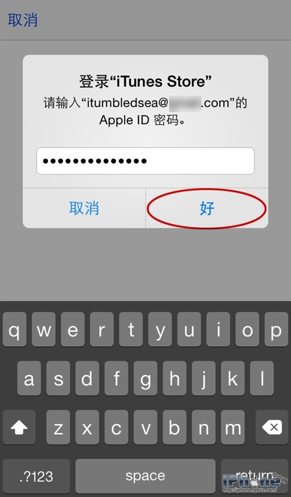 第五步:跳轉至App Store應用程序後,輸入Apple ID密碼並點擊右下角的「好」按鈕繼續。此步驟其實是確認用戶需要使用哪個Apple ID賬戶購入該應用程序。