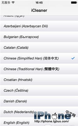 設置步驟:下拉至language selection(選擇語言),選擇中文,退出程序後,雙擊home鍵可看到後台運行的程序,將iCleaner完全關閉後重開就能看到中文版的iCleaner。