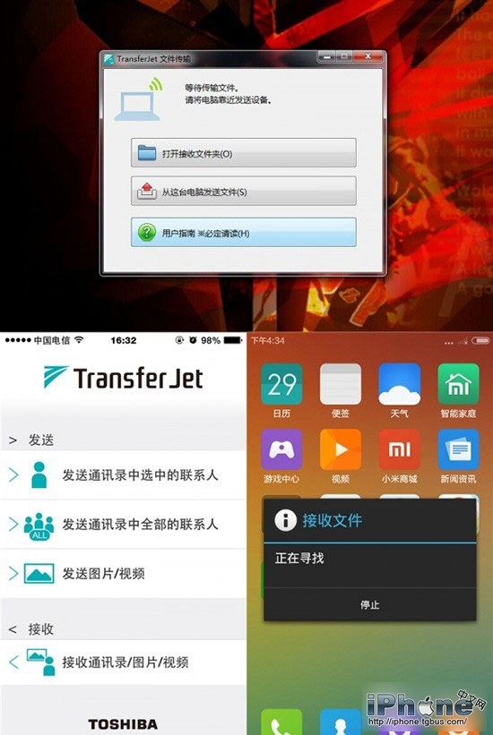 如果是三星手機給iPhone傳文件,操作方式就完全不同:先在三星手機上找到需要傳輸的文件,然後在「分享」的菜單中找到「TransferJet」,此時打開iPhone應用,選擇接收。