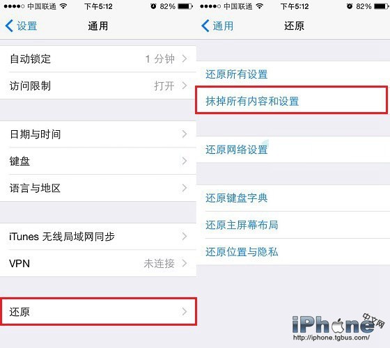 第二步:進入iPhone【通用】設置後,再進入【還原】設置,在還原設置中點擊進入【還原所有設置】或者【抹掉所有內容和設置】設置,如下圖所示。