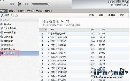 iTunes會自動同步連接的iPhone或iPad,同步完成後,點擊最下面的【語音備忘錄】