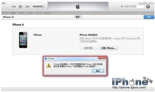4、電腦端的iTunes將會彈出:“iTunes已檢測到一個處於恢復模式的iPhone。您必須恢復此iPhone,然後再配合iTunes使用它。”如下圖所示。