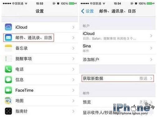 在我們不需要在收到郵件時立刻獲得推送,可以把這個功能關閉。打開“設置”——“郵件、通訊錄、日歷”,進入後關閉“獲取新數據”的推送,向下拉動,然後我們就可以自己選擇獲取郵件信息的間隔、比如每15分鐘、每30分鐘、沒小時或手動。這項設置關閉後會節約不少電量。