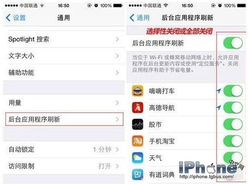 我們可以選擇性的關閉一些不經常使用的程序,或者完全關閉“後台程序刷新”功能。另外,我們還需要在“設置”——“iTunes Store和App Store”中關閉自動下載選項的更新。