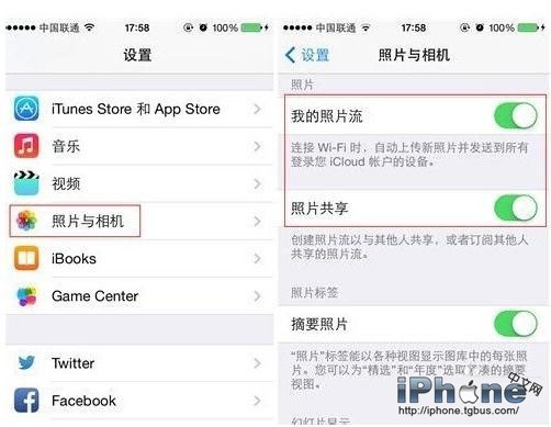 iPhone手機還提供了很多分享功能,照片就是其中之一,建議關掉。點擊“設置”——“照片與相機”,如果我們不需要將照片與其他蘋果設備上的用戶通過“照片流”分享,就可以關閉“我的照片流”和“相片共享”功能。