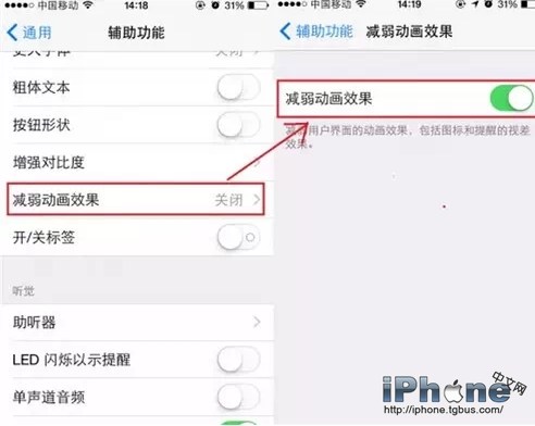 打開設置——通用——輔助功能——減少動態效果,然後點擊按鈕打開就可以了。開啟動畫效果會使內存占用更多,打開這個功能,在一定程度上能讓你的iPhone在運行更快更省電。