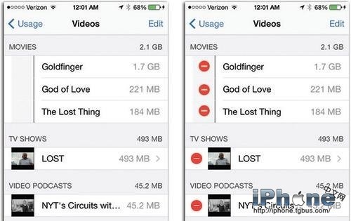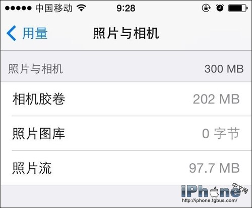 此列表顯示了相機膠卷、照片圖庫和照片流都占用了多少空間,但是,卻不能單獨刪除。刪除照片最快的方法是連接到iTunes,導入照片,然後刪除。