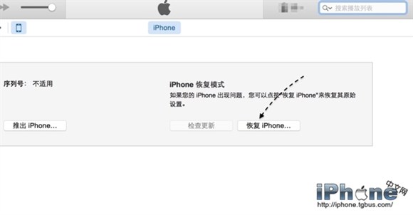 8、隨後請點擊iTunes窗口裡的“恢復iPhone”按鈕,如下圖所示。