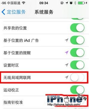 依次進入設置>隱私>定位服務>系統服務,將“無線局域網聯網”關閉,或再次打開。
