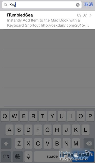 如主屏幕下拉呼出Spotlight搜索一樣,在信息對話列表的頁面你也可以使用同樣的手勢來呼出搜索框,輸入你需要查詢的關鍵字,即可動態顯示匹配的信息。