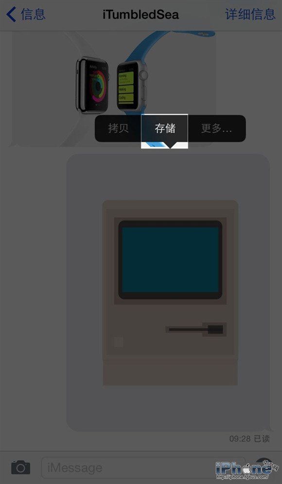 他人如果給你發來信息附件(可以是圖片、視頻、語音等),最常見最方便的操作莫過於直接在該附件氣泡上按住手指不放,直至彈出操作選項,點擊中間的“存儲”按鈕即可。