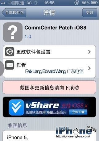 3、Cydia裡加源apt.appvv.com,裡面有CommCenter* patch for ios8是1.0版本的,其他的源裡也有這個插件補丁,但是版本不一樣6.13和6.14不能用,這個補丁作用是旁路掉運營商配置文件的數字簽名,從而允許自定義配置參數,不是直接干掉,因此理論上是可逆的;
