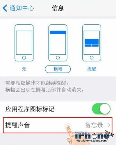 第三步,如果我們要設置那個程序靜音,我們只需要進入某個應用程序(例如信息),就可以進行“提醒聲音”、“在通知中心顯示”、“在鎖屏上顯示”等設置。