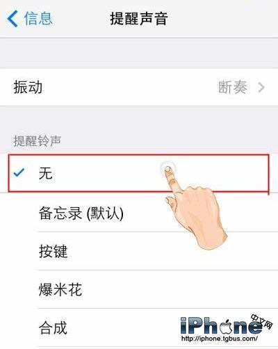 第四步,在我們進入到“提醒聲音” 就可以點擊“無”,即這樣信息就設置為了“靜音”模式 有消息就不會提醒了,只會靜音了。