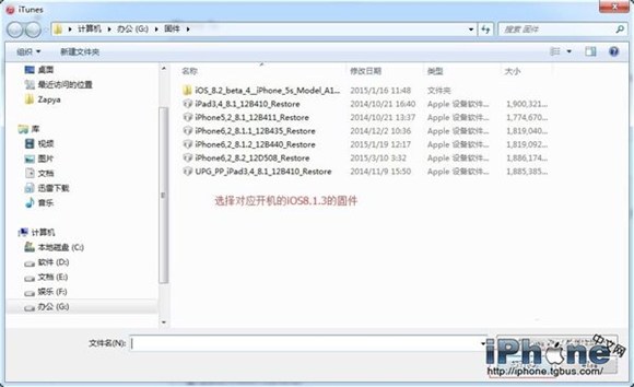 3、iTunes會彈出對話窗,選擇提前下載好的iOS8.1.3固件;
