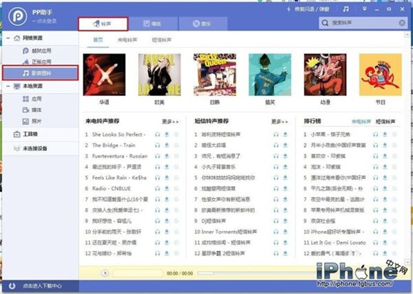 2、打開PP助手,點擊鈴聲--選擇鈴聲--導入;