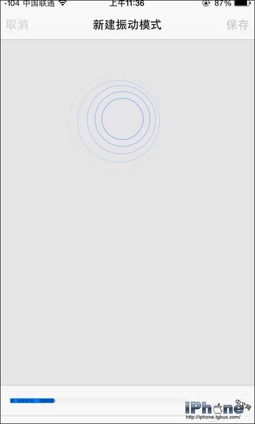 3、在這裡我們就是通過觸摸屏幕中央區域來定義如何振動,當手指按下即開始計時,最長可以錄制十秒,於是我們就能得到個性化的振動提醒方式了。