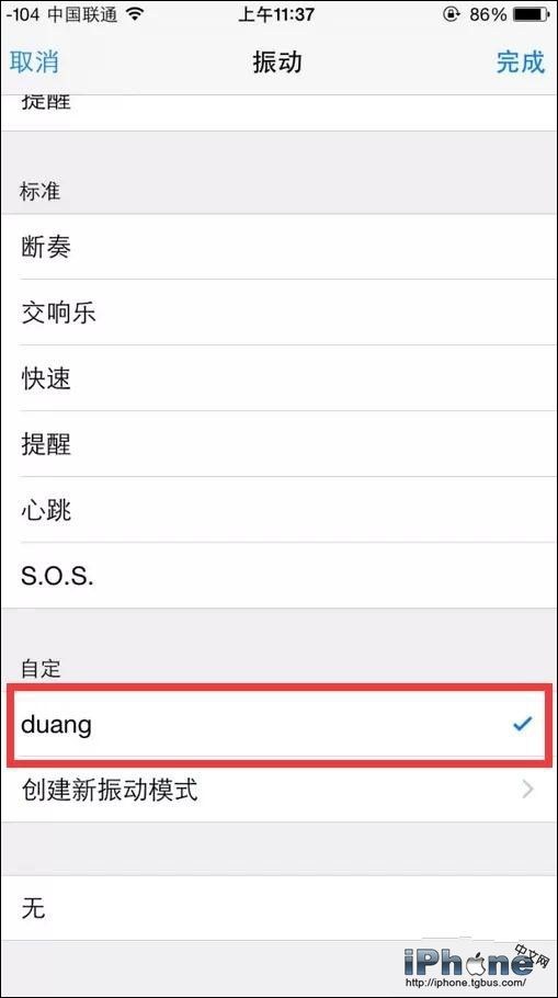 5、這樣就設置好了,當在上班或開會不方便開鈴聲的環境下,你把iPhone放兜裡,當你的重要人物給你打電話來,你不看手機也知道是他(她)了,誰的振動誰知道。