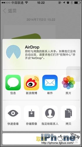 4、點擊浏覽,長按圖片會彈出分享工具欄。可快速查看全屏浏覽、存儲圖片、發送給指定聯系人、拷貝、打印等。也可通過中間欄應用分享,或采用 Airdrop 分享給他人。建議增加圖片的編輯功能,可放大縮小和塗鴉,這樣就更加方便記錄事件。