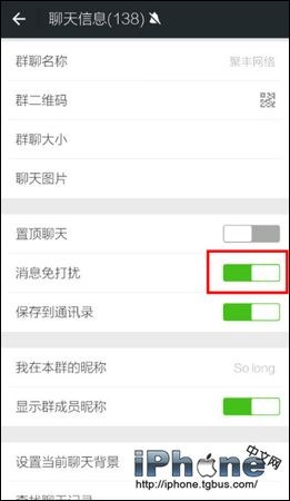 4、按鈕變為綠色,表示開啟消息免打擾,即屏蔽群聊。