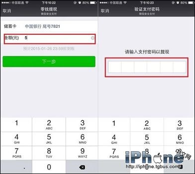 三、在零錢提現中,選擇好存儲卡(也就是選擇需要提現到的銀行卡,然後輸入要提現的金額,完成後點擊【下一步】,最後再輸入一次支付密碼以提現,如下圖所示。