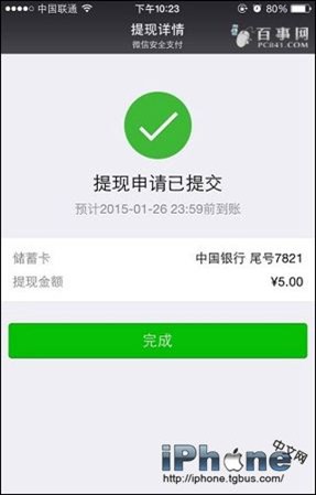 四、完成上一步後,就可以看到微信紅包提現申請已經提交的提示了,通常會在一個工作日內到賬,下方會顯示大概的預計到賬時間,只要點擊底部的【完成】就可以了。