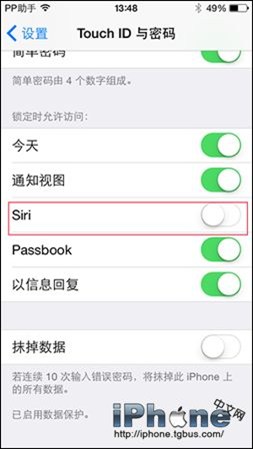 其實很簡單,大家只要打開“設置”,進入“Touch ID與密碼”,關掉鎖定時允許訪問Siri的按鈕就好了,以後只要鎖了屏,Siri就絕對不會出來搗亂了。