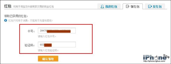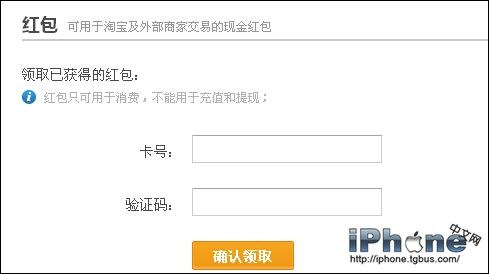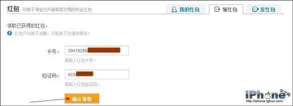 4、進入領紅包頁面後,輸入已獲得的紅包卡號和驗證碼。